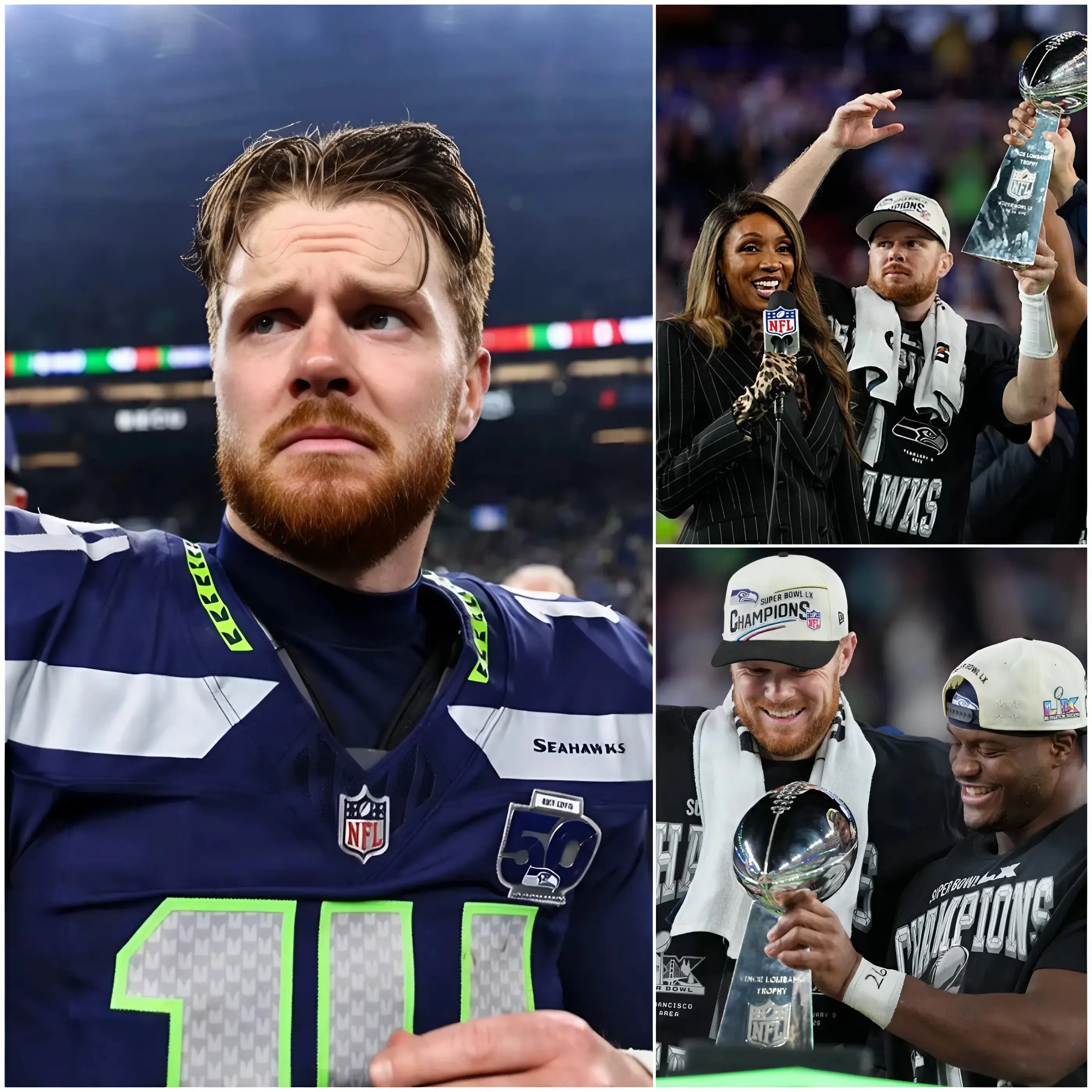 For fans watching at home, it was a moment that felt raw, unfiltered, and painfully human. The Seahawks had just dominated their opponent with authority, and Darnold, often described as one of the league’s most resilient quarterbacks, had played with poise and confidence. Yet beneath the helmet and the statistics was a man carrying a weight far heavier than any defensive pressure.