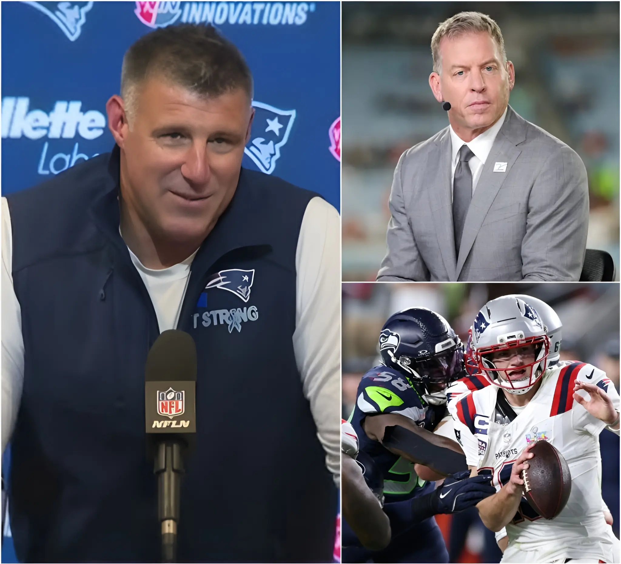 “After this game, I can’t call Drake Maye an elite quarterback anymore,” Troy Aikman declared on live television, insisting the Seahawks had completely figured him out, baited him into bad reads, and exposed cracks in his decision-making under relentless pressure. He argued Maye looked overwhelmed, a step slow, and unable to seize control when the championship moment demanded it most. The criticism sent shockwaves through the broadcast — but head coach Mike Vrabel immediately pushed back, defending his quarterback fiercely and stating that adversity reveals character, not weakness.