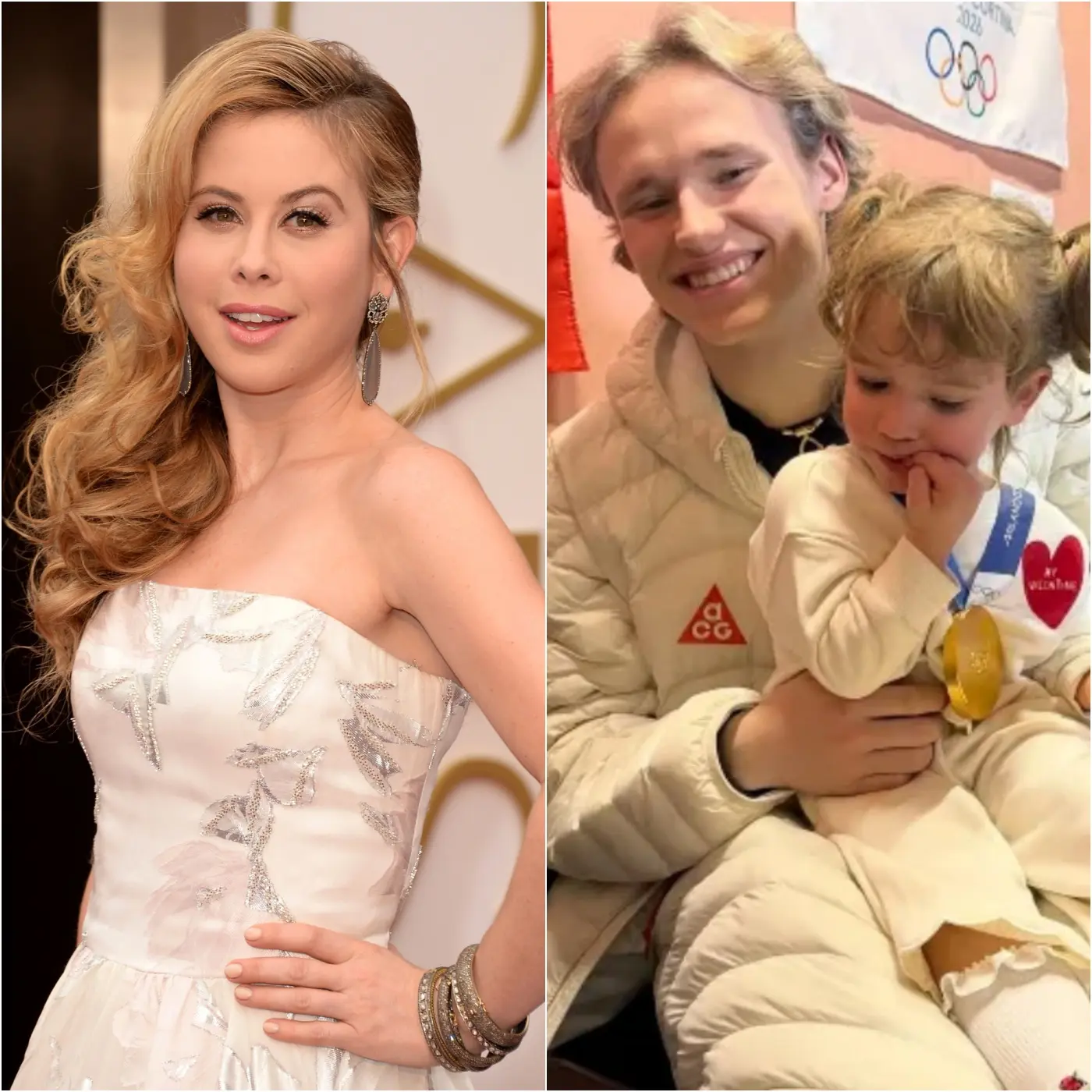 In a photograph that quickly went viral, Malinin can be seen gently placing his gold medal around the neck of Lipinski’s two-year-old daughter, Georgie. The toddler’s expression told its own story, her eyes wide with wonder as she looked up at the newly crowned champion. There was no script, no choreography, just a spontaneous moment that felt almost cinematic in its sincerity.