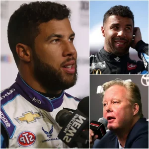 The NASCAR media room was still vibrating with engine echoes when Bubba Wallace strode to the podium, visor tucked under his arm, eyes…