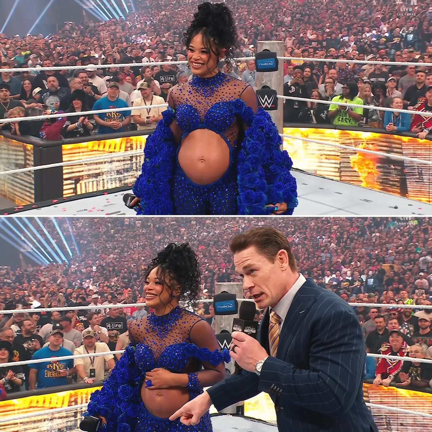 With that, Belair opened her jacket and proudly revealed her growing baby bump to a stunned and delighted audience. The Las Vegas crowd roared with applause, cheers, and chants of “EST! EST!” as tears welled up in Belair’s eyes. Cena, visibly moved, hugged her warmly, calling the moment a true WrestleMania surprise.