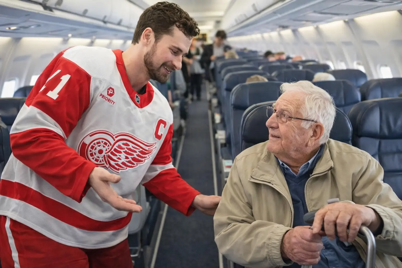 BREAKING NEWS: The entire NHL world is buzzing after Detroit Red Wings captain Dylan Larkin stunned passengers on a commercial flight with an unexpected act of kindness. According to multiple witnesses, he quietly gave up his first-class seat to an elderly U.S. veteran just minutes before takeoff — but that was only the beginning. What Dylan Larkin did next, away from the cameras and without saying a single word, reportedly left the entire cabin in tears and flight attendants speechless.