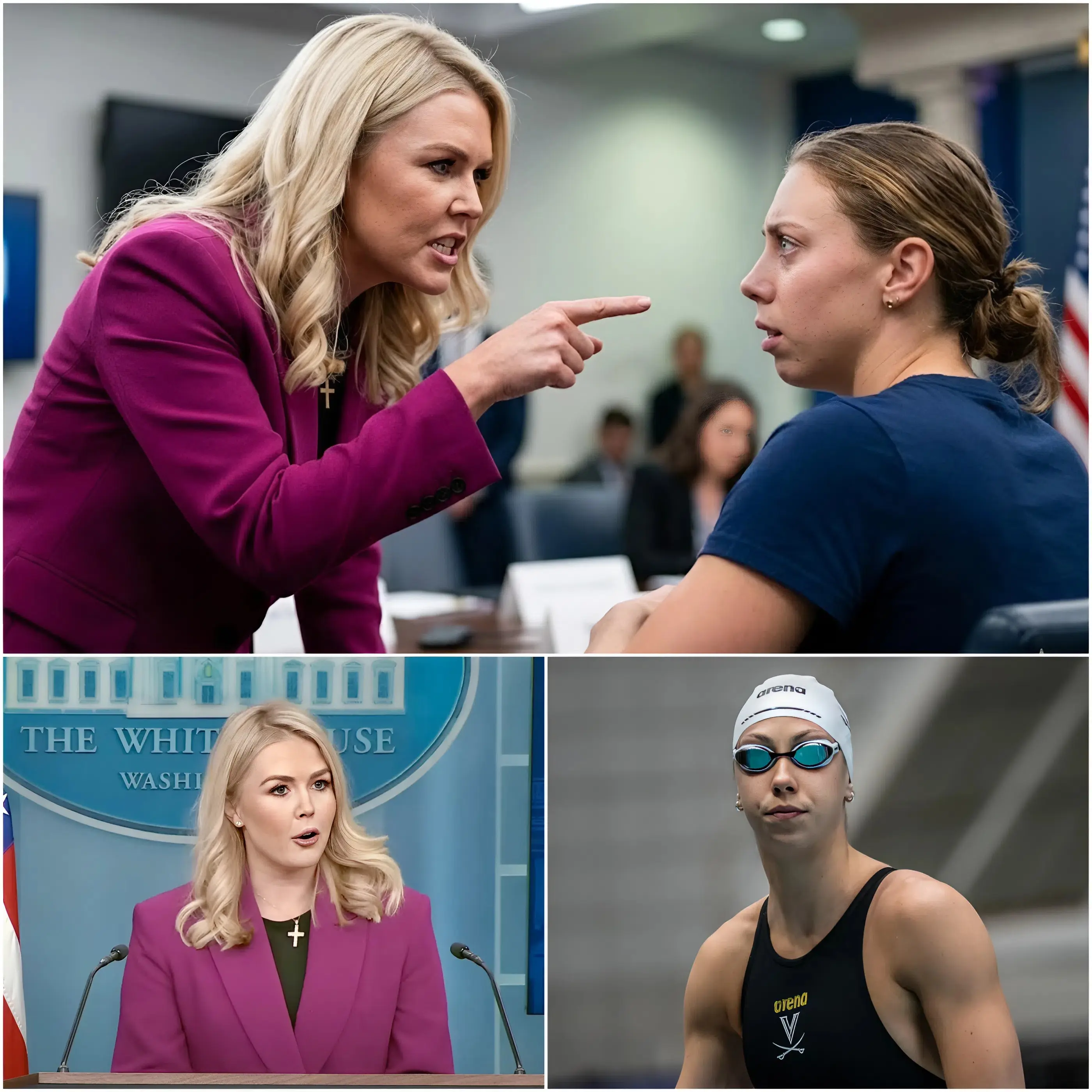 The atmosphere inside the crowded press auditorium shifted instantly when a shocking confrontation erupted between political figure Karoline Leavitt and swimming star Gretchen Walsh. Cameras were rolling, journalists were ready, and no one expected the tense exchange that would soon dominate headlines across the United States.