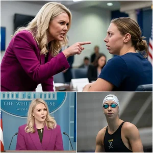 The atmosphere inside the crowded press auditorium shifted instantly when a shocking confrontation erupted between political figure Karoline Leavitt and swimming star Gretchen…