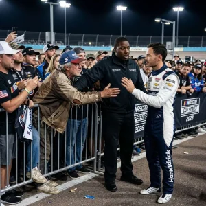 As security personnel were about to stop him, Kyle Larson calmly raised his hand and said, “Let him come closer.” A man in…