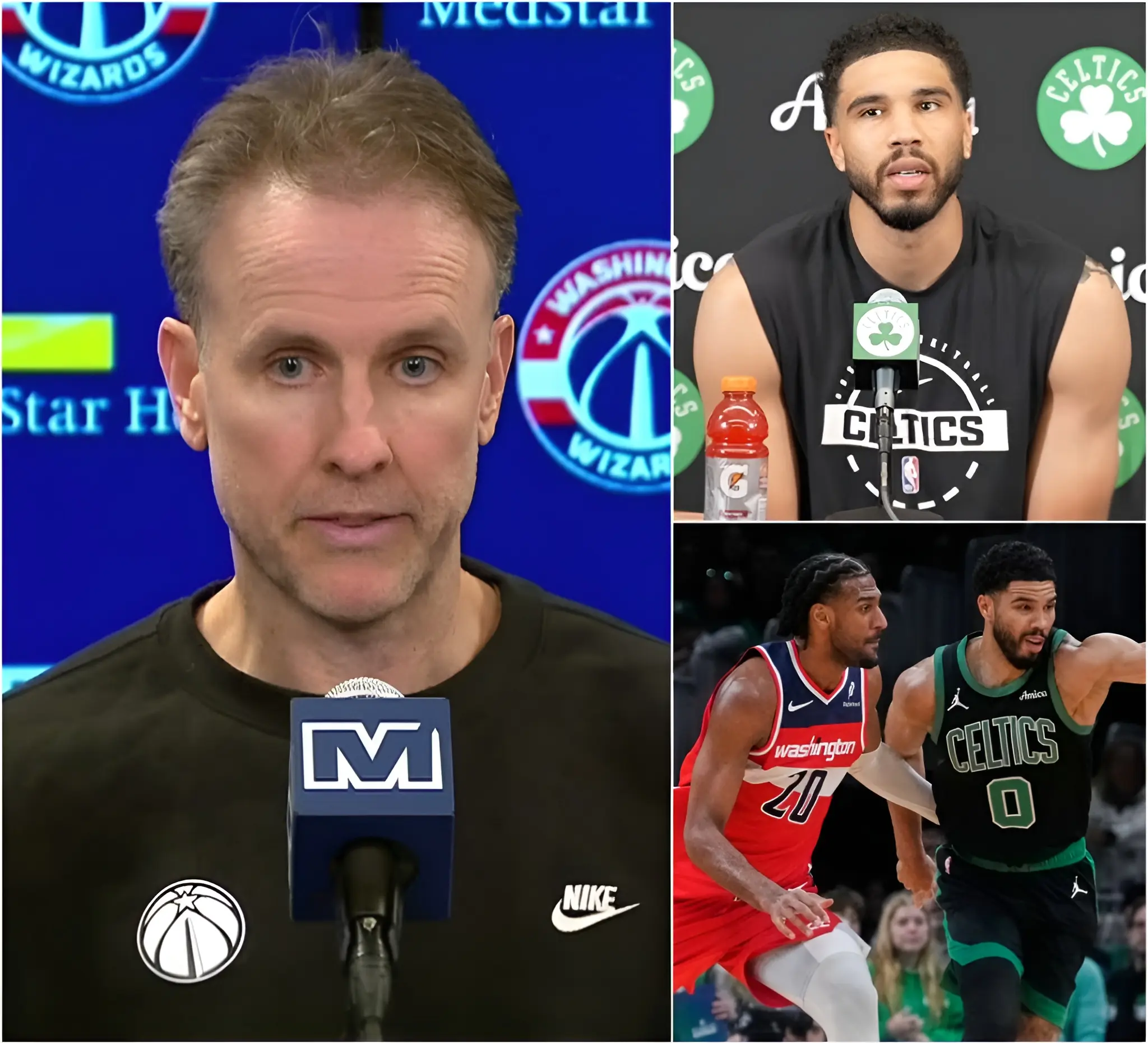 Some fans booed the accusation, others laughed in disbelief, and many simply stared toward center court where the confrontation was unfolding. The Celtics players looked confused, exchanging glances as if trying to process what they had just heard. Meanwhile, Wizards players awkwardly hovered around their coach, unsure whether to pull him back or let him continue speaking. Across the hardwood, Jayson Tatum stood near the scorer’s table.