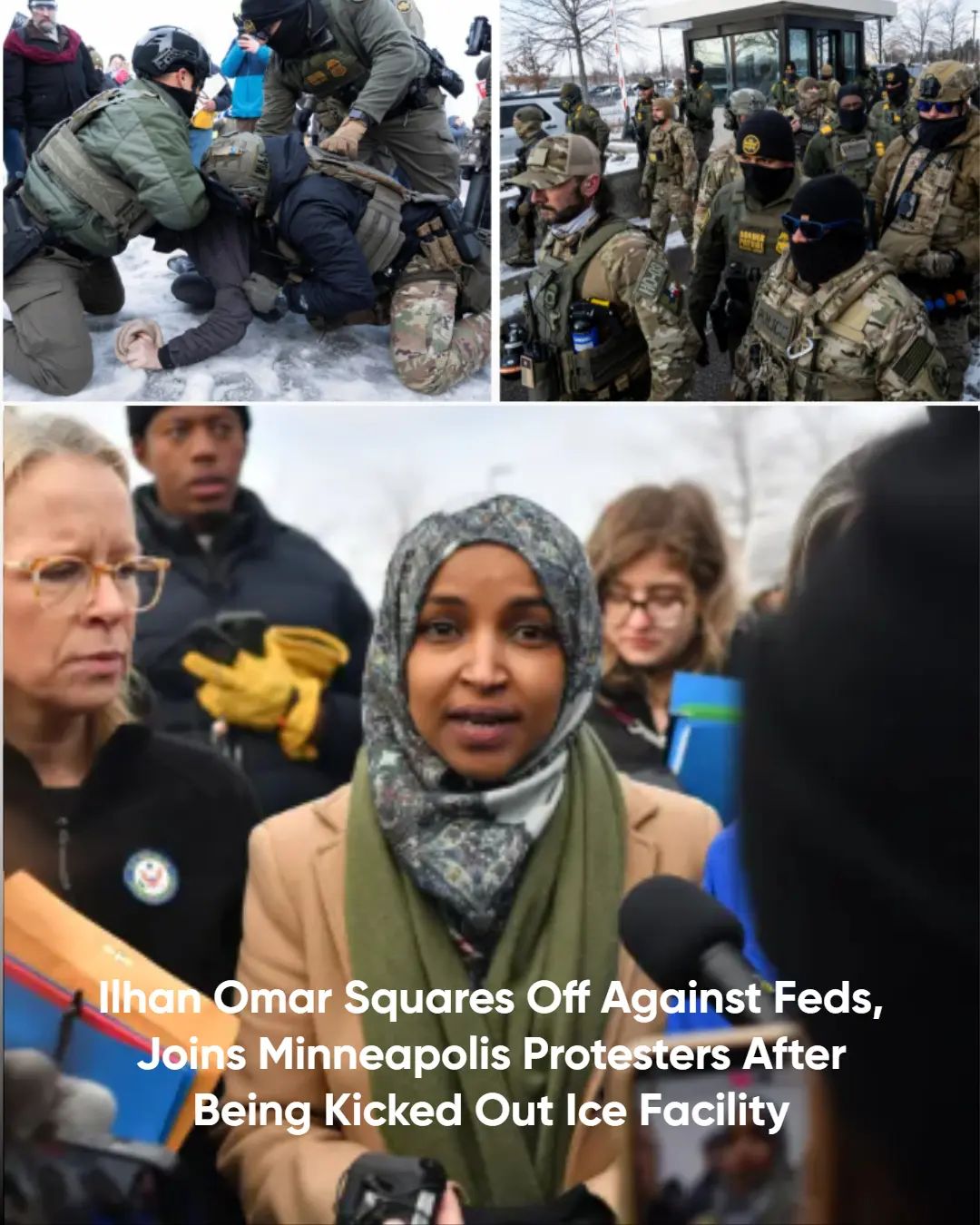 Congresswoman Ilhan Omar squared off against federal agents at an ICE facility in Minneapolis, joining protesters after she was kicked out of the detention center. Details in the comments 👇👇👇