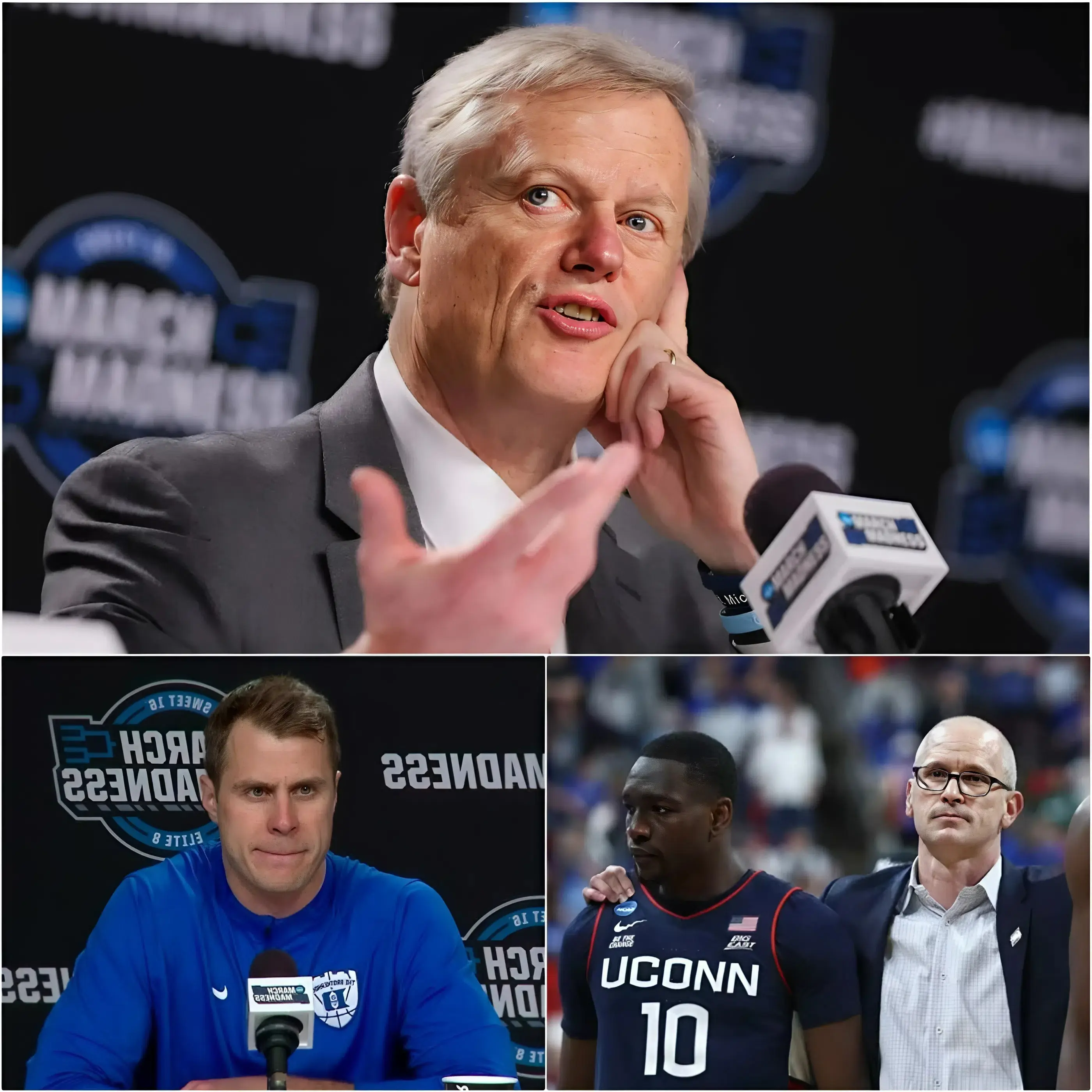 Ten minutes after Scheyer’s impassioned outburst captured headlines, the unexpected happened. NCAA President Charlie Baker made a surprise appearance at the postgame media area. The room fell silent as cameras focused on the leader of college sports. In a moment that left players, coaches, fans, and analysts across the country speechless, Baker delivered a single, concise sentence that cut through the chaos: