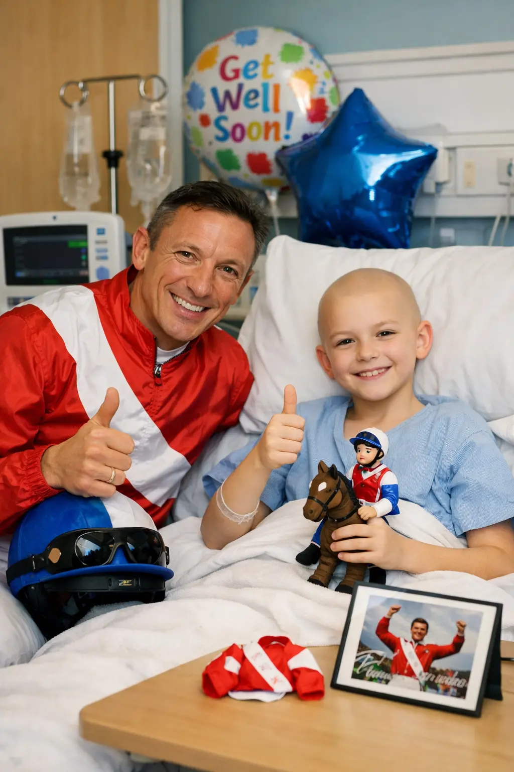 Inside the hospital, children facing long treatments suddenly encountered a familiar smile from horse racing television screens, though many had never witnessed a race live or felt the atmosphere of a major equestrian event.