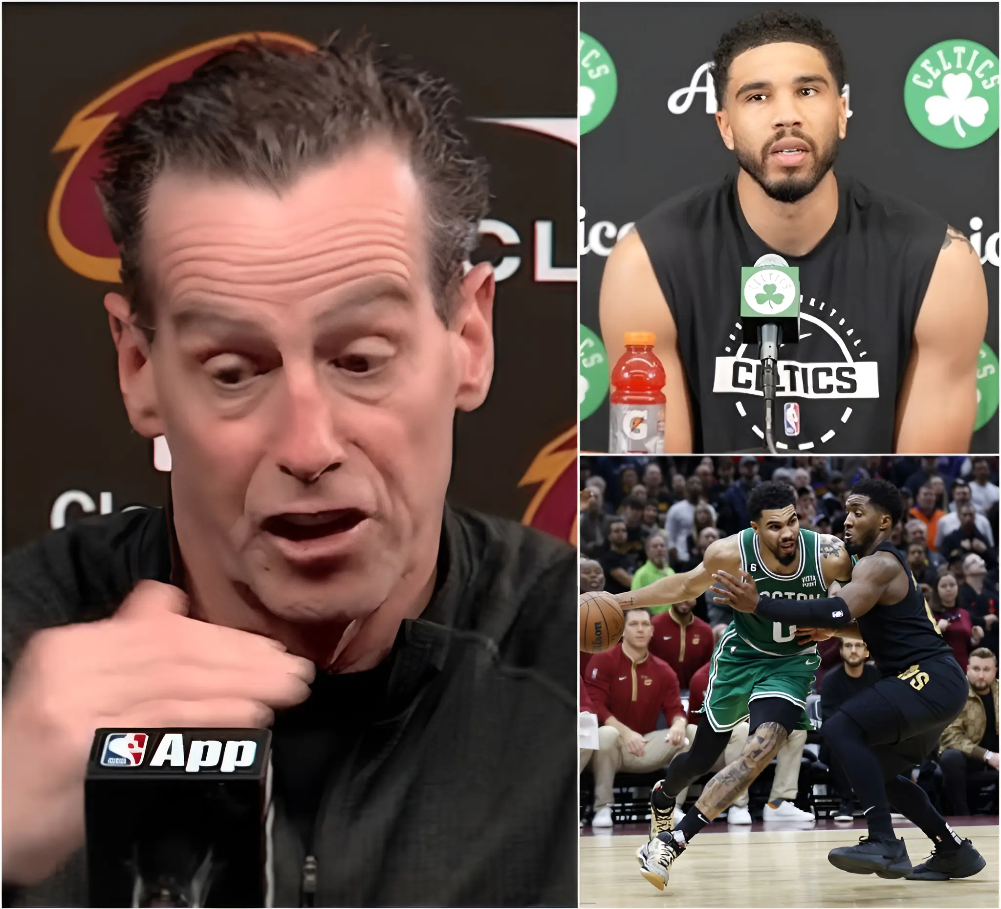 “He cheated!” The accusation exploded into the air only seconds after the final buzzer confirmed the Cleveland Cavaliers’ humiliating 98–107 loss to the Boston Celtics. The noise inside the arena had barely settled when Cavaliers head coach Kenny Atkinson stormed toward the sideline, his face burning red with fury and disbelief. Cameras from every major broadcast network rushed to capture the moment as Atkinson pointed directly across the court at Celtics superstar Jayson Tatum, loudly accusing him of using high-tech equipment to gain an unfair advantage during the game.