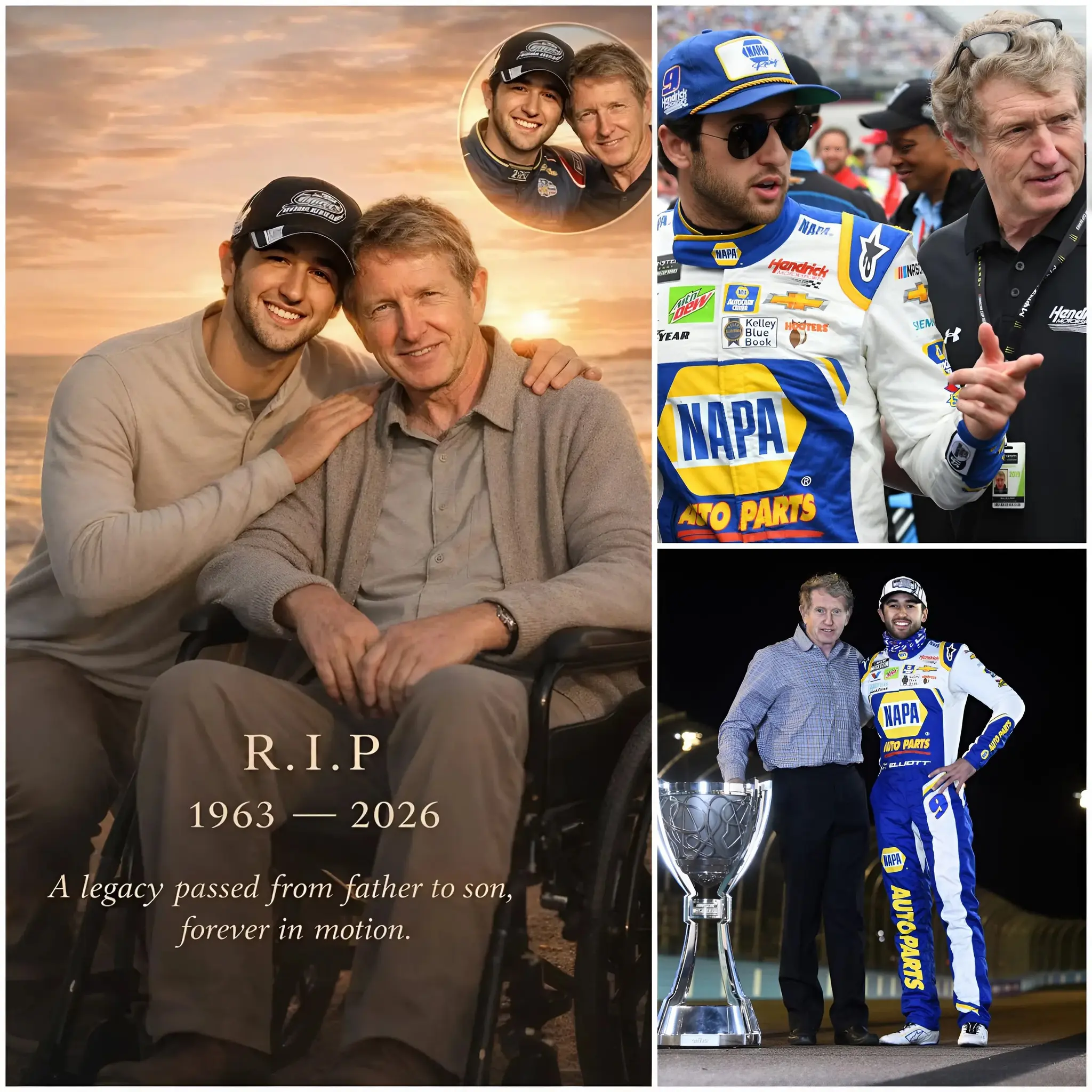 Bill Elliott, whose very name once symbolized speed and ferocity, left the world not with a roar but in silence, enveloped by the care of the son who refused to let go. Chase’s grip tightened slightly, and he whispered again, “I’ve got you, Dad.