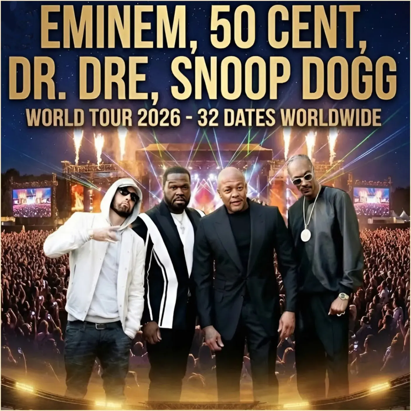 Hip-hop history is being rewritten as legendary artists Eminem, Snoop Dogg, Dr. Dre, and 50 Cent officially announce their massive 2026 World Tour. The global run, which includes 32 arena and stadium dates across North America, Europe, and Australia, is already being hailed as one of the most ambitious and culturally significant tours the genre has ever seen. From iconic cities like Los Angeles and New York to international capitals such as London and Sydney, the tour promises a truly worldwide celebration of hip-hop excellence.