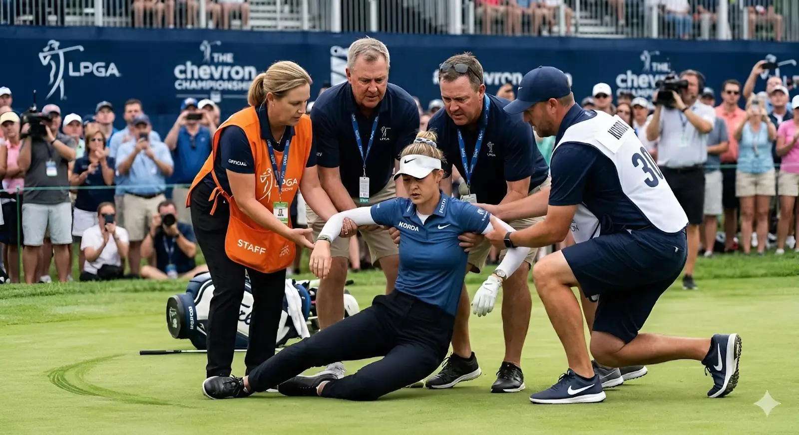 Security staff quickly cleared space around the golfer to allow trainers and medical professionals to assess her condition. Spectators in the nearby grandstands fell silent, many holding their breath as they watched one of golf’s brightest stars receive immediate attention. The scene underscored the intense physical demands placed on elite athletes during comeback preparations.