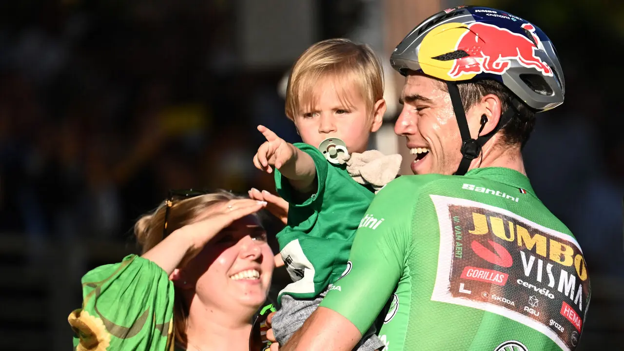 In 2025, tijdens de Tour-etappe in Saint-Vulbas, fleurt Wout op als hij Sarah en Georges ziet. Terwijl hij losrijdt op de rollen, rent de vierjarige naar hem toe. “Zijn glimlach was beter dan elke etappezege,” bekent Wout nu. “Ik liet hem de bus van het team zien, met alle gadgets.