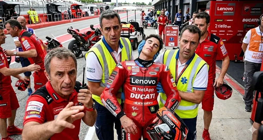 A wave of shock and confusion swept through the training facility of Ducati earlier today after Marc Marquez suddenly collapsed during what had begun as a routine practice session. Witnesses described the moment as abrupt and deeply unsettling.