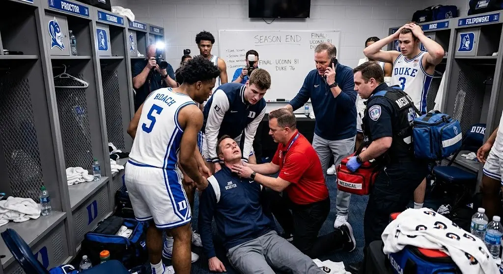 As players and staff processed the painful defeat, the mood shifted from disappointment to panic when Scheyer suddenly collapsed while addressing the team.