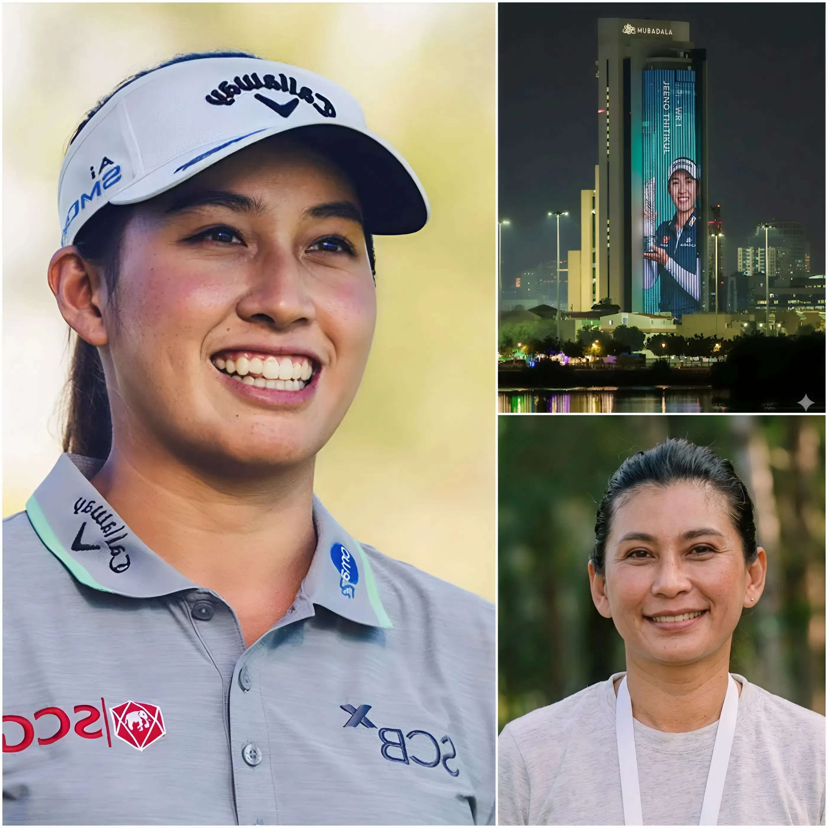 Last night, in a city defined by towering glass and steel, something unexpected transformed the skyline into a deeply human moment. The Mubadala Tower, usually a symbol of modern ambition and global finance, suddenly came alive with waves of emerald, deep blue, and crimson light. The colors moved slowly, deliberately, until they formed a face that many instantly recognized—Jeeno Thitikul. What appeared at first to be a stunning visual display quickly became something much more meaningful, especially for those watching from below.