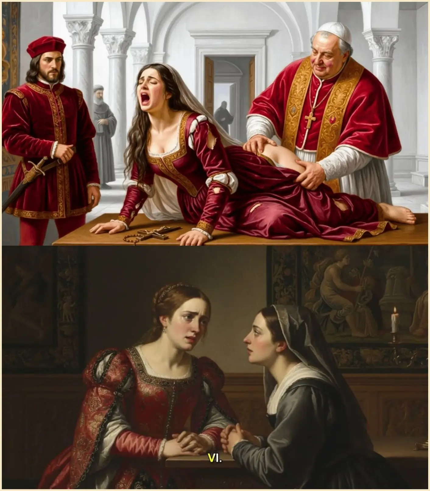 أما ابنتاها المراهقتان، فقد تعرضتا لاغتصاب جماعي من قبل الجنود الرومان، في فعل وحشي يهدف إلى تدمير شرف العائلة الملكية وكسر روح الشعب بأكمله. كان هذا الاغتصاب سلاحاً نفسياً شائعاً في الحروب الرومانية، يرمز إلى “غزو” العدو على مستوى أعمق، ويردع أي محاولة تمرد مستقبلية.