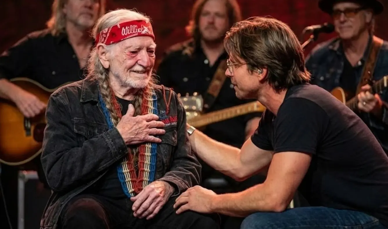 Willie’s fingers faltered—just for a heartbeat—mid-phrase. He turned his head first to the right, then to the left. Recognition washed across his face, followed by something rarer: unguarded emotion. His eyes, usually half-hidden beneath the brim of habit and cool, shone wet under the lights. For three endless seconds, the only sound was the soft sustain of open strings and the distant hum of expectation.