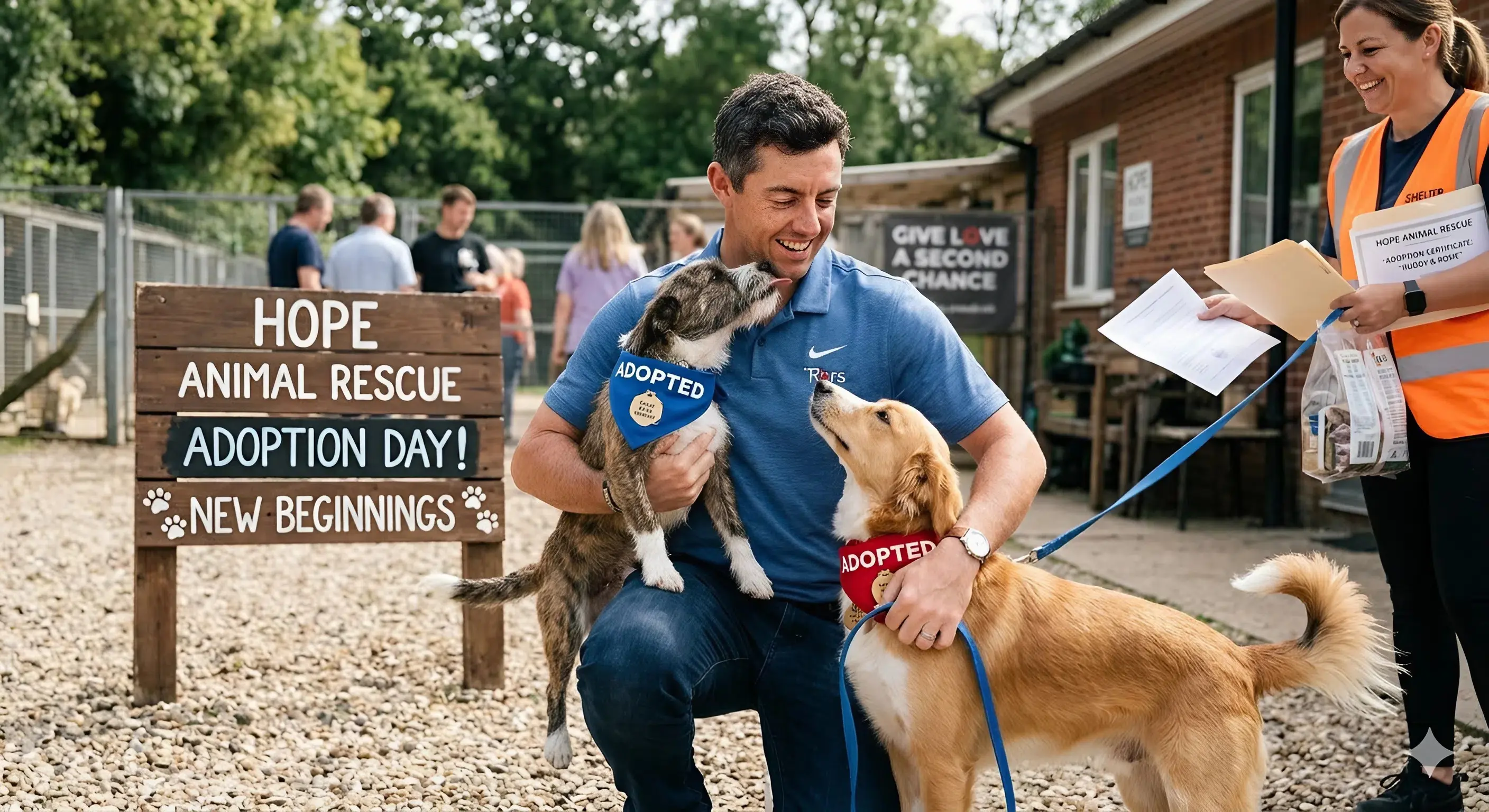 The revelation came unexpectedly. A staff member at a struggling animal rescue center in Northern Ireland uploaded a simple photo online. In the image, two newly adopted dogs sat calmly beside a familiar face that millions of golf fans instantly recognized. The caption did not mention a publicity campaign or a charity event. Instead, it told a quiet story about how the center had narrowly avoided closing its doors thanks to a generous donation that had arrived at exactly the right moment.