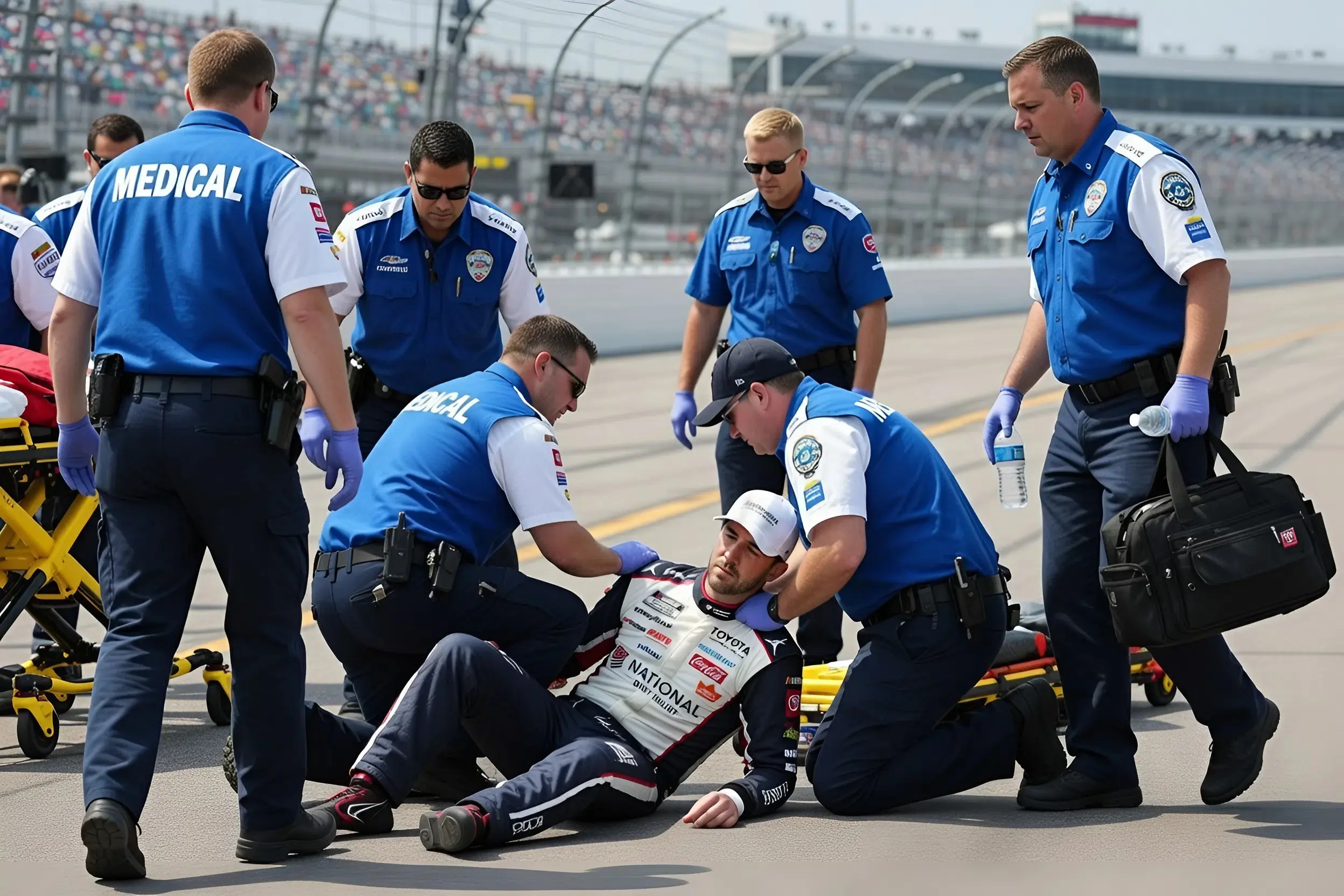 Medical personnel stationed at the track immediately rushed toward the scene. NASCAR safety officials, paramedics, and team staff formed a protective circle around the fallen driver while emergency equipment was quickly brought to the pit lane to assess the severity of the situation.