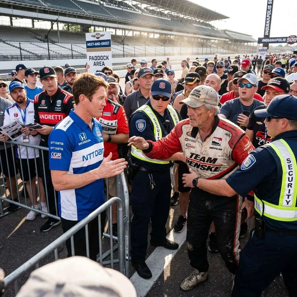 Security staff tried to stop him, but Scott Dixon calmly raised his hand and said, “Let him come closer.” A man in his late fifties, wearing an old pair of racing shoes, a faded 2008 IndyCar Series champion cap, and a worn Team Penske jacket, was pushing his way through the crowd as Dixon greeted fans during a meet-and-greet after the second practice session at the 2026 Indianapolis 500. Security immediately stepped in, fearing a potentially dangerous situation or an overly enthusiastic fan.