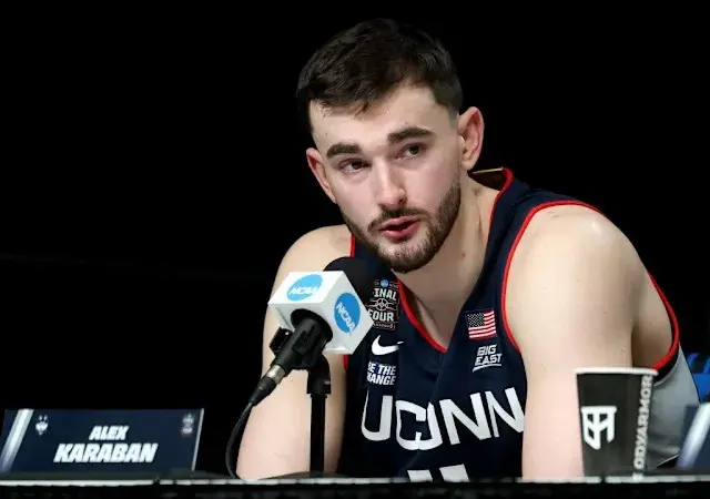 Alex Karaban, composed but visibly charged with post-game adrenaline, stepped into the media spotlight. He had just come off one of the most intense performances of his career. His voice was steady, but there was an edge—subtle at first, then unmistakable.