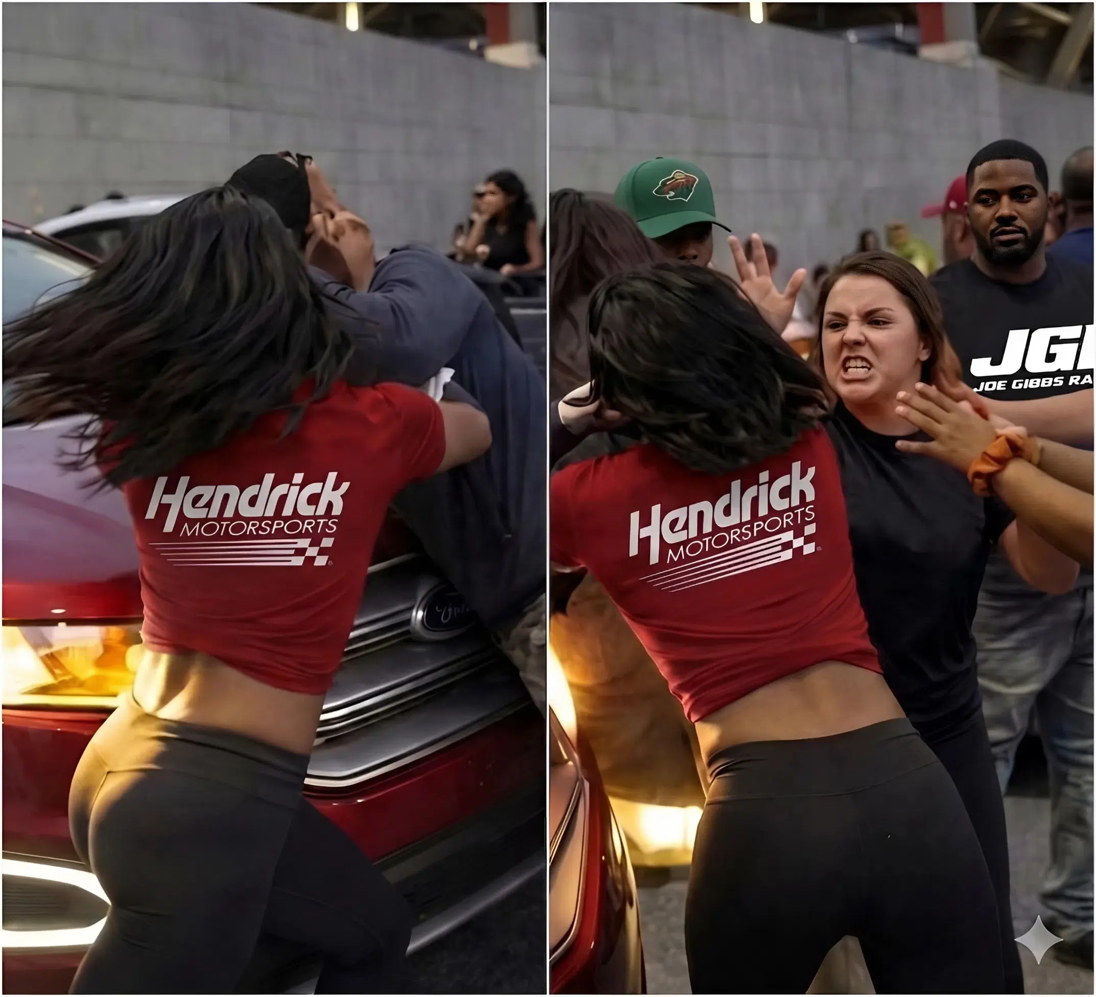 Two fans of Hendrick Motorsports and Joe Gibbs Racing shocked everyone after a wild altercation broke out in the fanzone before today’s Cup Series green flag.