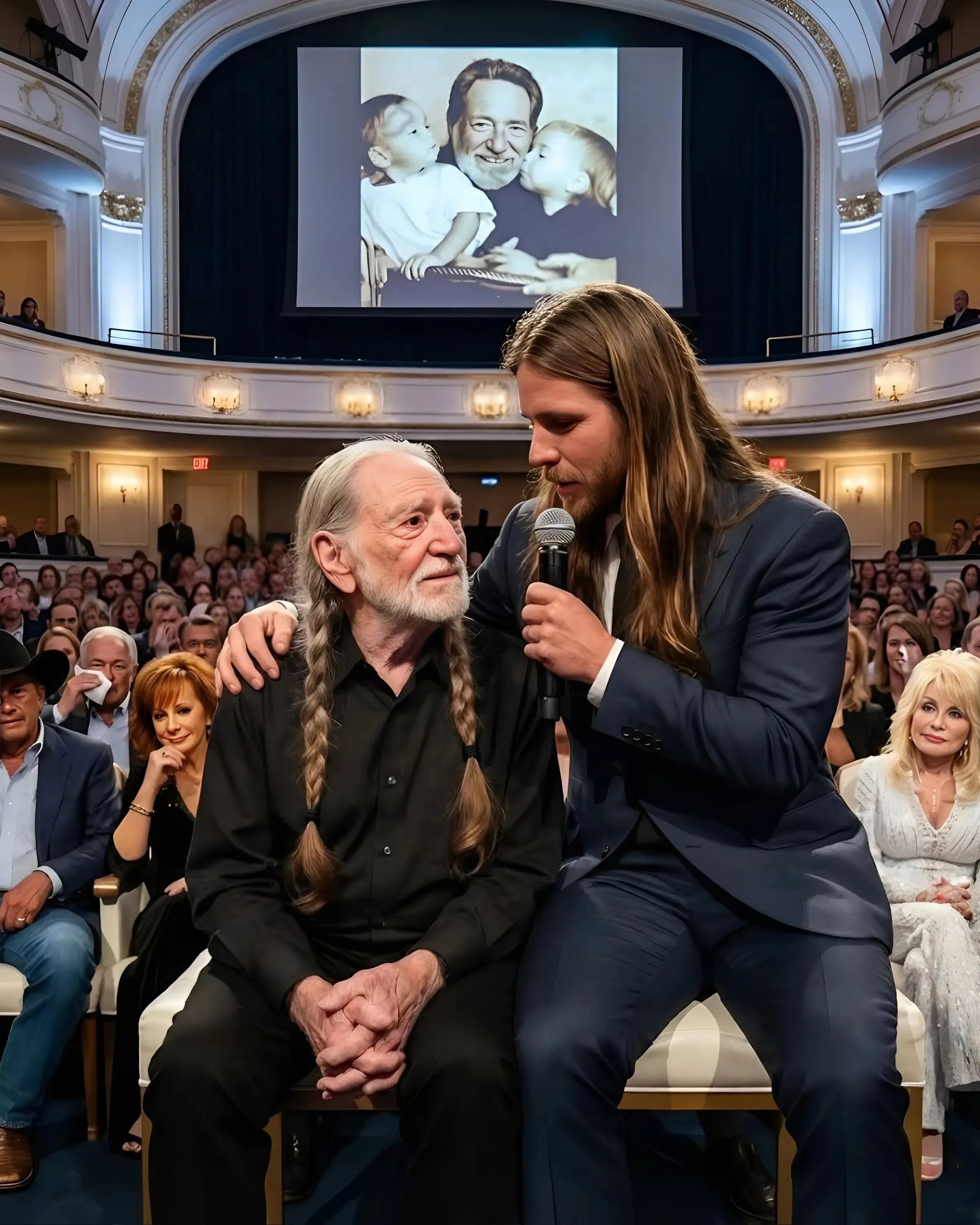 When they started singing, something settled in the air like dust after a long Texas wind. Willie’s voice—worn thin by ninety-plus years, gravelly and intimate, carrying the weight of every barroom, every heartbreak, every sunrise on a tour bus—didn’t compete with Lukas’s steadiness. It leaned into it. Lukas’s tone was clearer, more anchored in the present, yet it carried unmistakable echoes of the same phrasing, the same gentle catch at the end of a line that has always marked his father’s delivery.