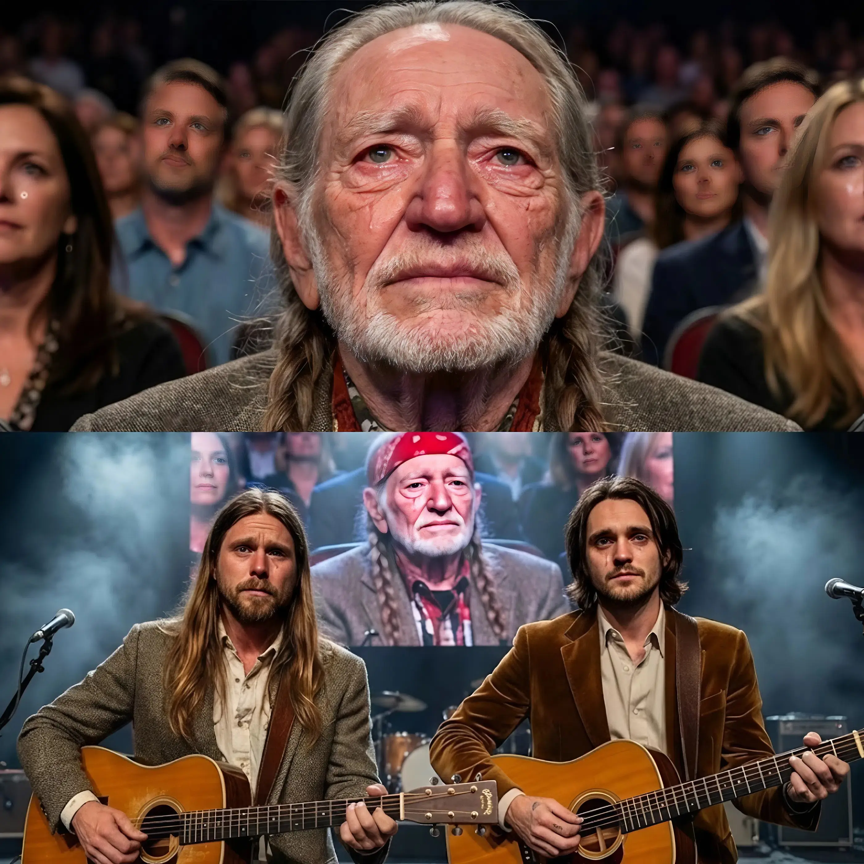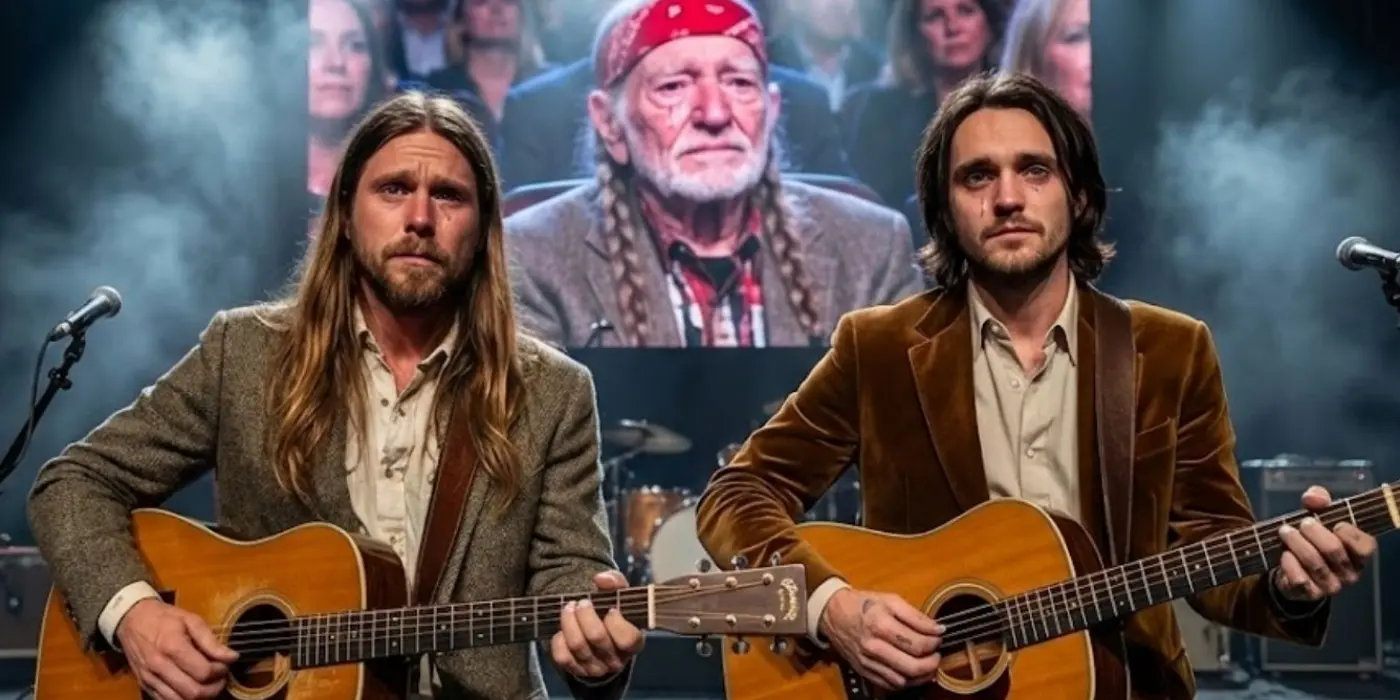 The brothers didn’t rush. They let the spaces between notes breathe. Micah’s harmony dipped and soared, sometimes taking the lead on a phrase, sometimes falling back to let Lukas carry the weight alone. Their guitars answered each other in quiet conversation—fingerpicked runs that mirrored the way Willie himself had always played, loose and conversational, never flashy. The audience remained frozen, caught in the spell. A woman in the third row pressed a hand to her mouth. An older man removed his hat and held it over his heart like a prayer.