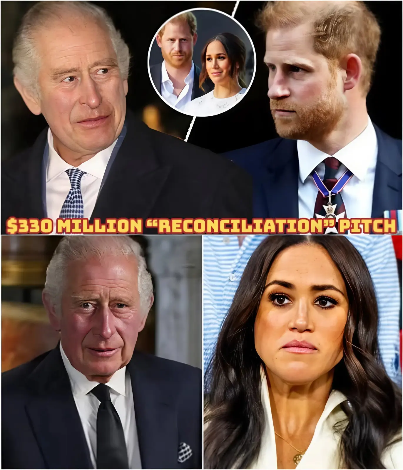 “YOU CAN’T BUY YOUR WAY BACK IN.” That icy line is echoing through royal gossip circles after reports claimed King Charles III flatly shut down an alleged $330 million “reconciliation” pitch tied to Prince Harry and Meghan Markle, making it brutally clear that any path forward would come without cash, without leverage, and without restored status. According to online chatter, the King’s stance was blunt — reconciliation, if it ever happens, is about duty, not deals — with one palace-adjacent voice allegedly scoffing, “Titles aren’t negotiation chips.” Meghan has previously insisted, “I won’t be silenced or minimized,” while Harry has warned that his family “can’t keep pretending nothing happened,” yet the message from the Palace side couldn’t sound colder: no money talks, no perks return, and no crowns are part of the conversation. In the end, the rumor paints a stark picture — when the door finally closed, it wasn’t slammed by anger, but locked by principle, leaving the Sussexes staring at a future where reconciliation comes stripped of everything they once monetized…
